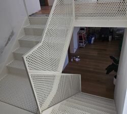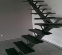 un escalier avec limon centrale et marche découper au laser.L'ensemble est traité avec une patine effet bleue